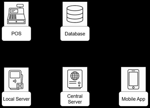 The system includes four main components: the POS, a local server in the store, a central server, and a mobile app. The local server, running on a microcomputer (Raspberry Pi), receives receipt data from the POS via webhook and enables user identification through QR code or NFC. Once identified, the receipt is sent to the central server, which stores it and notifies the user via the app. If no identification occurs at checkout, a unique QR code is generated for delayed linking. The user can scan it later to retrieve the receipt. All receipts are accessible and manageable in the app.