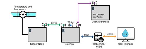 The system consists of four components: a sensor with a corresponding node, a gateway, a database, and a visualization unit. The node collects the sensor data and transmits it to the gateway via LoRaWAN. The gateway stores the data locally and forwards it to the database via WiFi or Ethernet. There, the data is visualized in charts and processed as part of a game, while a traffic light-style lamp indicates the water consumption of a user.