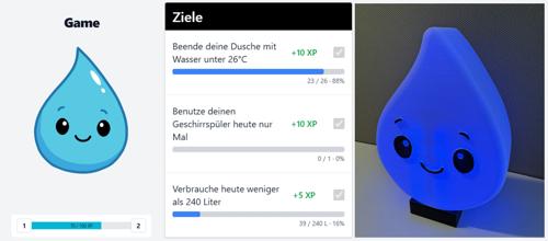 The web application consists of two main parts. On one hand, a dashboard displays the water consumption and temperature curve using charts. On the other hand, a playful approach is used to raise awareness of personal behavior: A water mascot evolves when tasks, based on the previously measured data, have been completed.
