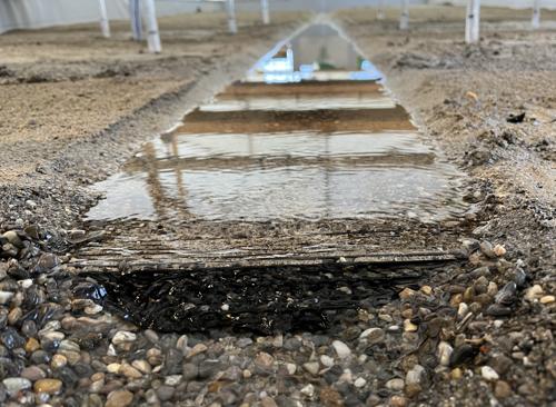 Die Grössenordnungen für den Aufbau der Versuche werden aus 40 Stichproben des "Biber-Auenmodell für die Schweiz" gewonnen. Der Versuchsaufbau entspricht in der Natur einem Gerinne mit einer Sohlenbreite von 2.00 m, einer Gerinnetiefe von 2.00 m, einem Sohlengefälle von 1.00 % und einem Abfluss von ca. 0.66 m3/s. Der abstrahierte Biberdamm wurde unter Verwendung eines 3D-Druckers gefertigt und mit Rundsand befüllt, um einen natürlichen Biberdamm zu imitieren. In der Natur entspricht der Biberdamm einer Höhe von 1.10 m und wird im Rahmen der Modellversuche mit ca. 6 mm überströmt. In den Versuchen wird ein Rundsand 0/4 verwendet, welcher ungeachtet der physikalischen Eigenschaften (z.B. Kapillaren) einem grobkiesigen Boden in der Natur entspricht.