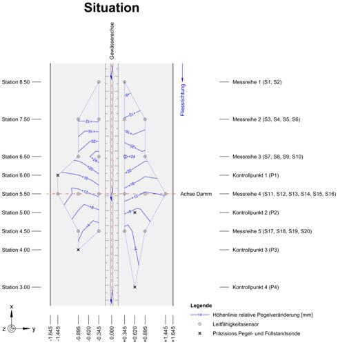 Die Überwachung der Grundwasserpegel erfolgt über die Staustrecke des Biberdamms bis 2.50 m unterhalb des Biberdamms. Im Rahmen der Untersuchung erfolgt neben der Erhebung der Pegelhöhen auch die Ermittlung des präferenziellen Fliesspfads sowie der Strömungsgeschwindigkeit des Wassers aus dem Gerinne in das Grundwasser. Die Markierversuche erfolgen unter Verwendung von Uranin und einer Fluoreszenzanalyse.