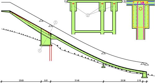 Mehrere Varianten werden modelliert, vordimensioniert und wichtige Details konstruiert. Anhand von Bewertungskriterien wurde in einer Nutzwertanalyse die Bestvariante ermittelt. Bei dieser wurden Tragwerksdetails, die Lage der Vorspannung (rot markiert in Abb. unten), sowie abhebenden Kräfte in der Gründung analysiert und in mehreren Schritten optimiert.