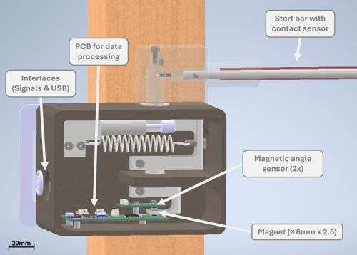 A novel start gate system was developed that transforms traditional mechanical triggers into a comprehensive measurement platform while maintaining core timing functionality (See Fig. 1). The mechanical structure was designed using CAD software and manufactured through 3D printing combined with machining techniques. Two custom PCBs were developed to integrate the sensor electronics into a complete measurement system. (See Fig. 2)