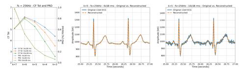 The algorithm achieved an average compression factor (CF) of 5.7 with Root Mean Square Difference (PRD) <0.3 % using k = 5 bit quantization (lossy stage CF = 11 bit/6 bit = 1.83). The CF dropped only slightly (by 0.5) under high noise (10× LSB rms). The Huffman encoding stage alone yielded just a CF of 2.44. Hardware simulations matched Python results in CF and PRD. ASIC post-layout simulations at 1.8 V showed <200 nW power consumption and <150 µm × 150 µm chip area per compression unit.
