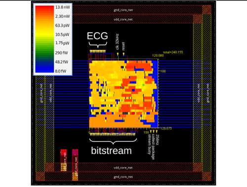 The algorithm was translated into VHDL and simulated using the open-source GHDL simulator. It was then synthesized with Genus, placed and routed using Innovus, and post-layout simulated in Xcelium via X-FAB’s 180 nm Cadence-based ASIC flow. The post-layout results were verified against GHDL simulations. Finally, a vector-based power analysis was performed using 2 seconds of MIT-BIH ECG data as input.